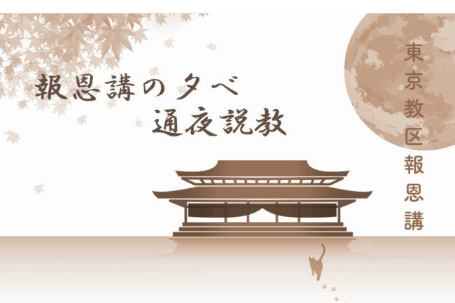 通夜説教とはその名の通り、亡き人を縁として夜通し教えをいただく機会を表現したものです。お通夜の原型はお釈迦さまの入滅後、悲しんだ弟子たちがご遺体を見守りながら7日間にわたって、生涯をかけて説かれたお釈迦さまの教えを、夜…